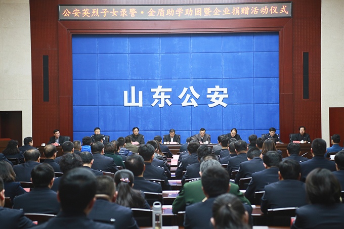 12月23日下午,由山东省人民政府、山东省公安厅、省慈善总会、省民政厅、省公安民警优抚基金会联合举办的“公安英烈子女录警·金盾助学助困暨企业捐赠活动仪式”在省公安厅正式启动,山东省副省长、公安厅厅长孙立成,省公安厅党委委员、副厅长闫希军,省民政厅党组成员、副厅长张魁中,省公安厅党委委员、政治部主任修春清,省烟草专卖局党组书记、局长吴洪田,省公务员局副局长于顺水,金天国际董事局主席祖明军,省公安民警优抚基金会理事长姜永梅等领导出席,各市公安局、各直属公安局、济南铁路公安局政治部、厅直各单位、2016新录公安英烈子女及家长、受助学生及民警代表共150人参加了本次仪式。