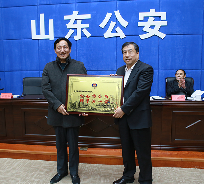 (山东省副省长、公安厅厅长孙立成向金天国际颁发了“爱心金盾”牌匾及荣誉证书)