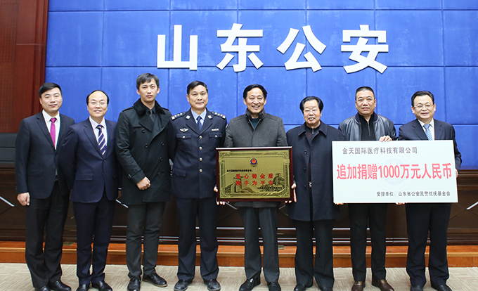 仪式由省公安厅党委委员、政治部主任修春清主持。金天国际继2015年1月向山东省公安民警优抚基金会捐赠800万元后,再次追加捐赠1000万元,善款将全部用于缓解公安英烈、因公伤残和因病致贫民警家庭困难和促进公安民警职业健康保障体系建设,金天国际集团董事局主席祖明军登台完成捐赠,山东省副省长、公安厅厅长孙立成感怀企业善举接受捐赠,并向金天国际医疗科技有限公司颁发了“爱心金盾”牌匾及荣誉证书。省人社厅领导宣布了全省13名符合条件的公安英烈子女通过相关招录程序录警,金天国际董事局主席祖明军与山东省副省长、公安厅厅长孙立成等相关部门领导现场将361.46万元助学助困金发放到因公牺牲和家庭困难民警子女、患重大疾病民警、因公伤残民警手中。