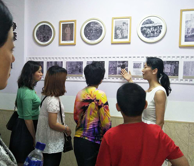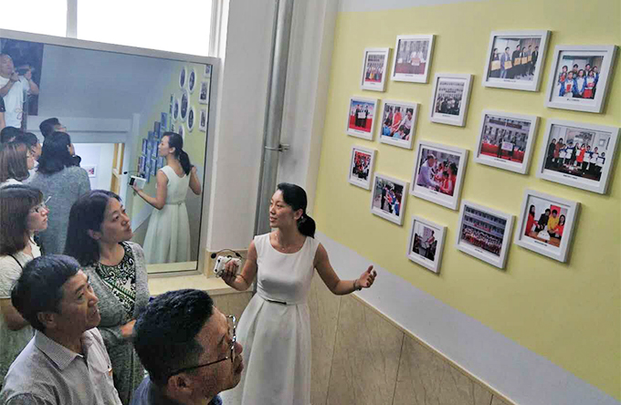 (向与会人士介绍烟台特殊教育学校发展历史)