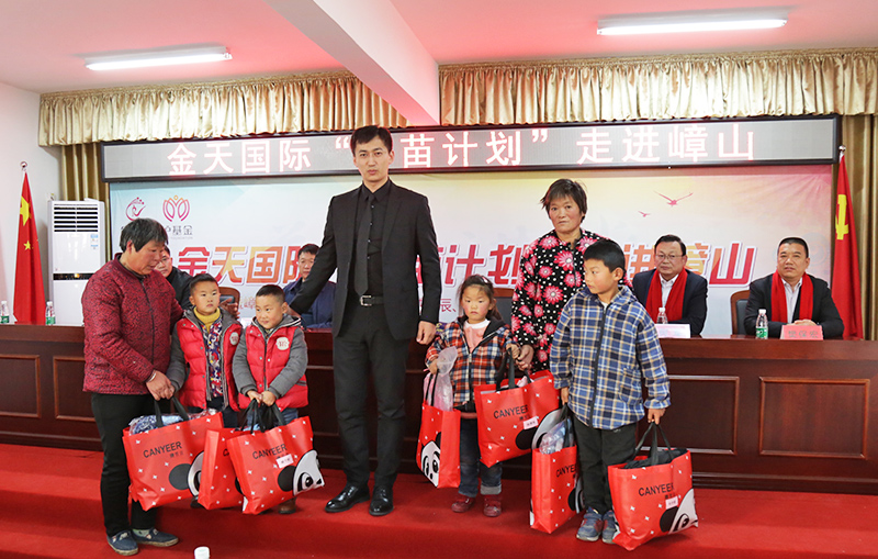伴随着“金天国际号”高铁品牌专列的全速启程,把健康之爱传向四方。11月30日下午,承载着爱与希望,金天国际“公益护苗计划”走进嶂山,为嶂山因贫失学的“贫困儿童”进行精准救助与关爱。宿迁市湖滨新区祥和社区党委书记刘邦超,宿迁市湖滨新区管委会副调研员、扶贫办主任王益军,金天国际公益基金会理事长祖威,金天国际公益基金会秘书长何军,金天国际公益基金会常务理事樊保宏及金天双创市场理事会理事,嶂山实验幼儿园老师、受助学生、社区乡亲们及宿迁电视台、宿迁日报近100人齐聚魅力嶂山,感受浓浓的金天情。
