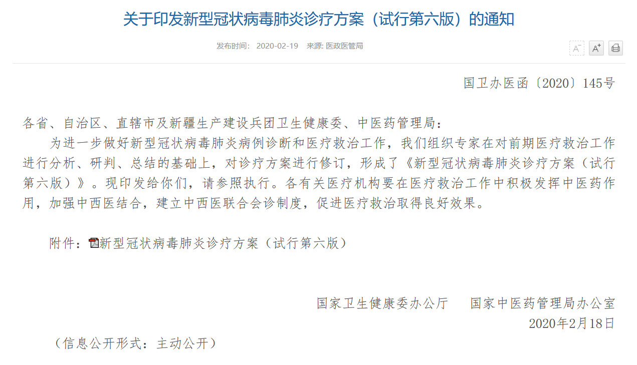 几千年来,在中国历代疫病防治过程中,中医药已经形成了一整套系统且独特的理论和实践体系。历史上,中医药充分发挥了对抗疫病的重要作用,有力地保障了中华文明的延续。在2003年抗击非典的过程中,中西医结合的治疗方式曾发挥了重要作用,被世界卫生组织评价为“安全有效的途径”。面对如今的新冠肺炎疫情,中医药防护治疗的独特优势也在不断显现。2020年2月19日国家卫生健康委员会发布了《新型冠状病毒肺炎诊疗方案(试行第六版)》,进一步明确了中医治疗方案,要求积极发挥中医药作用,加强中西医结合,并增加了中医药具体用法。
